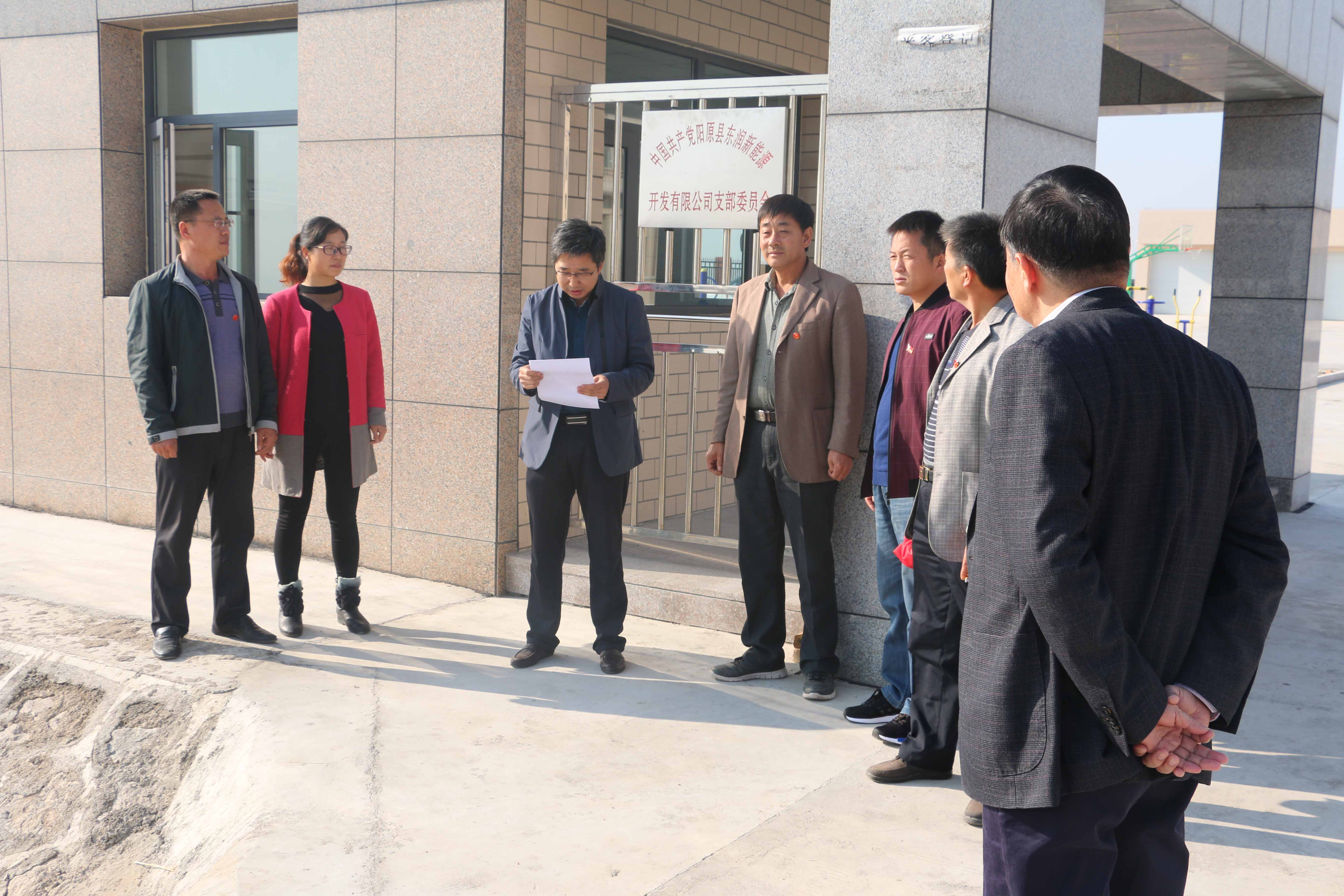 2016年10月14日,阳原东润新能源开发有限公司在开阳堡光伏电场举行党支部成立揭牌仪式。阳原东城镇党委书记李志军、工会主席王强出席揭牌仪式并讲话,对公司党支部工作室相关制度的建立及落实情况提出表扬。集团公司副总裁、阳原项目部项目经理林文通,阳原东润新能源开发有限公司党支部书记卢玉仁及全体党员参加揭牌仪式。