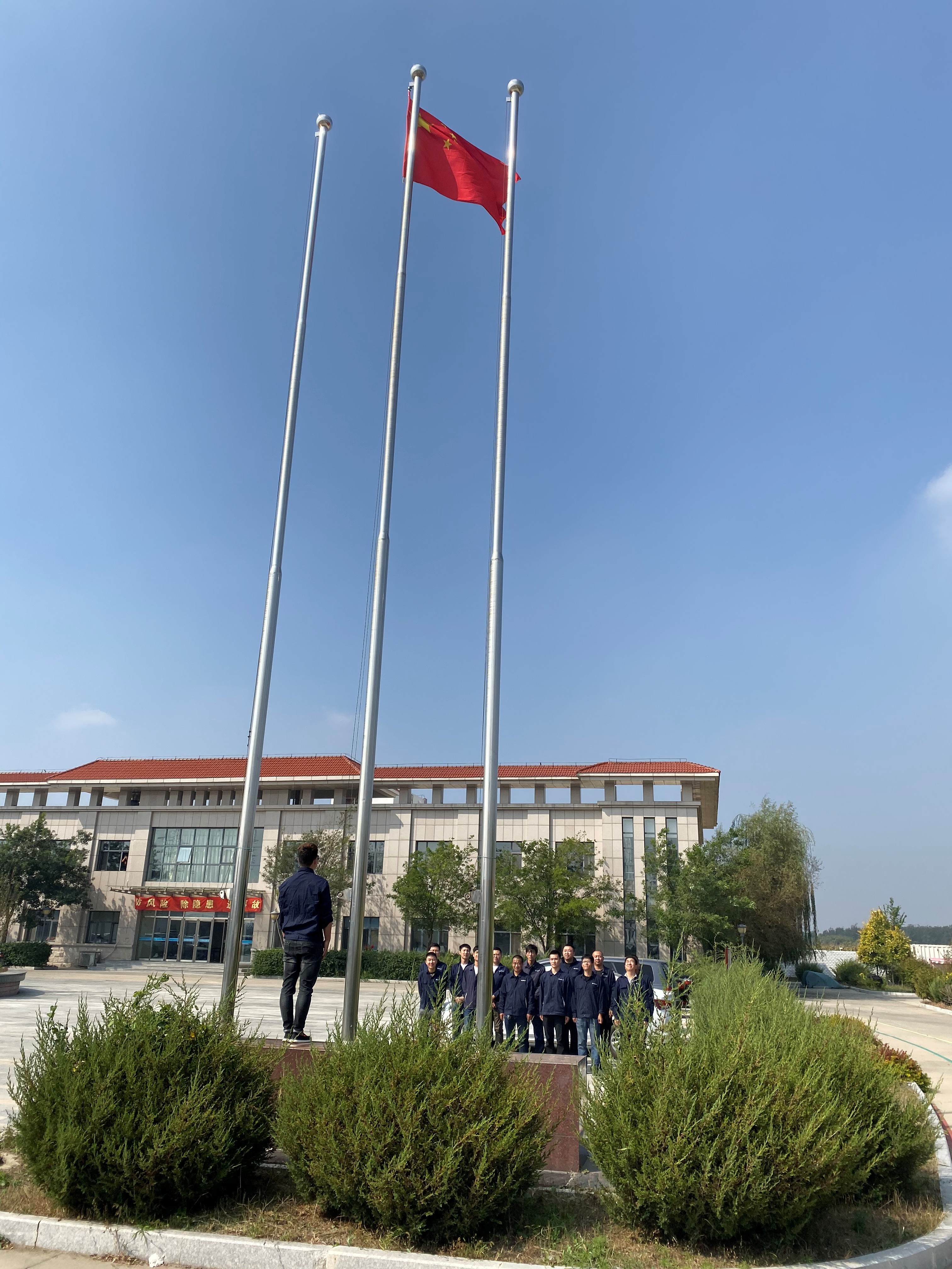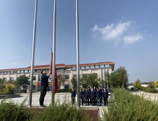 云淡风轻、秋意盎然间,国庆在这个繁忙的季节里悄然而至。为进一步增进员工之间的互动交流、增强员工的集体意识和团队协作能力,丰富员工业余文化生活,陶冶爱国主义情操,9月29日康平朝阳堡风电场举行“守初心、担使命、迎国庆、升国旗”仪式,迎中华人民共和国成立70周年。王场长带领全体员工齐聚综合楼广场举行升旗仪式。在庄严的国歌声中,鲜艳的五星红旗冉冉升起,迎风飘扬。大家向国旗行注目礼,每个人心中涌起对伟大祖国的无限热爱和美好前程的祝福。