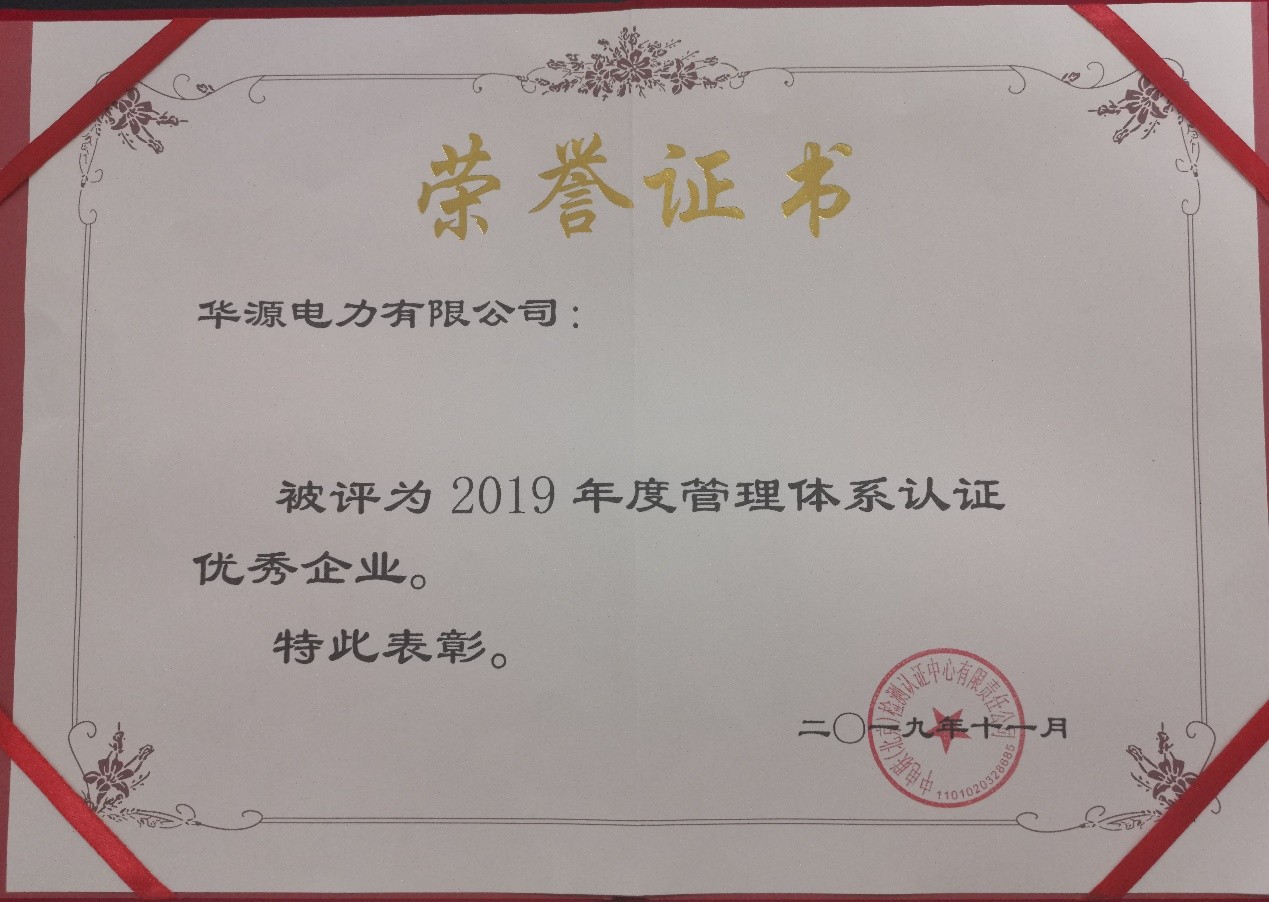 近日,中电联(北京)检测认证中心对2019年度获证企业管理绩效进行了评价,我公司荣获“2019年度管理体系认证优秀企业”称号。